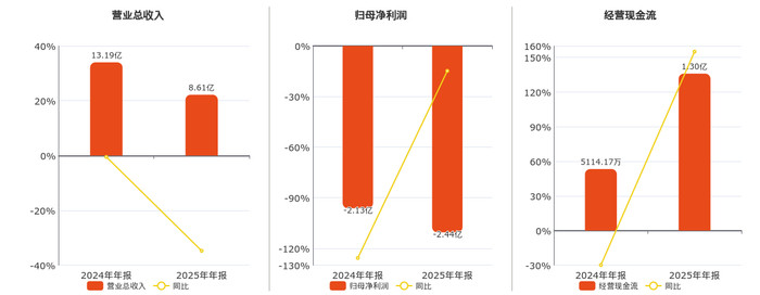 公司营业总收入为8.61亿元,在已披露的同业公司中排名第33,较去年同报告期营业总收入减少4.58亿元,同比较去年同期下降34.74%。归母净利润为-2.44亿元,在已披露的同业公司中排名第43,较去年同报告期归母净利润减少3148.69万元。经营活动现金净流入为1.30亿元。