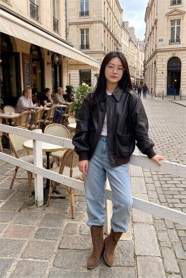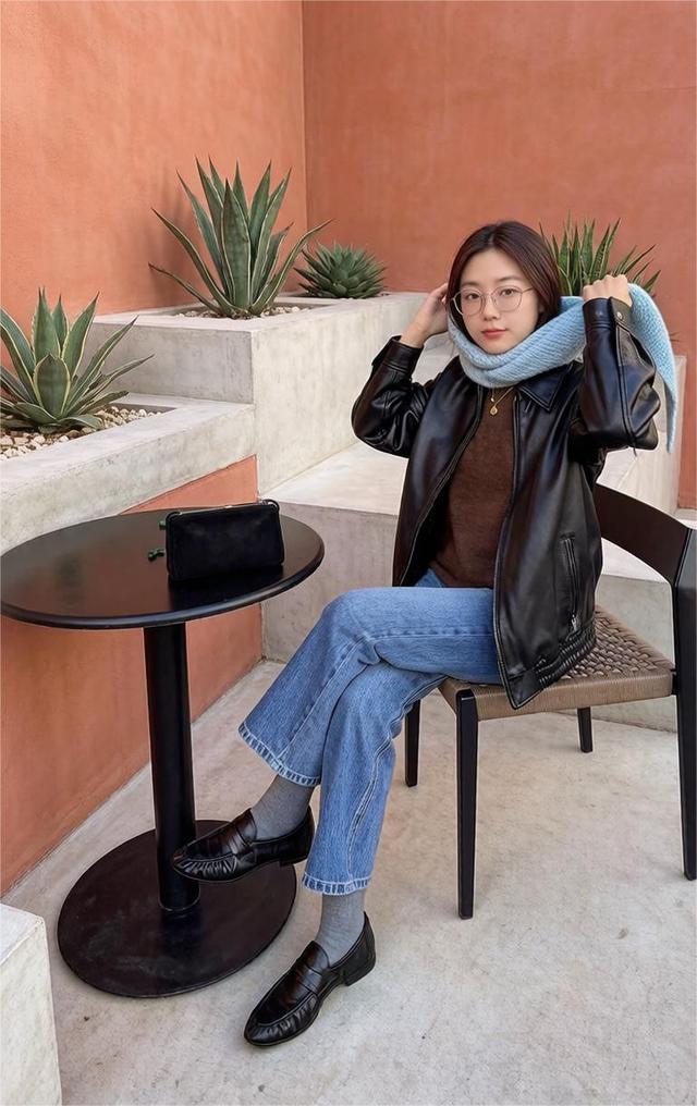 在挑选与皮衣搭配的下装时,长裤和半裙时常交替出现,皮衣+长裤时,优先推荐蓝色牛仔裤,两者搭配经典基础,时髦精、普通素人都能借鉴,是一款完全照搬照抄都不会出错的造型。