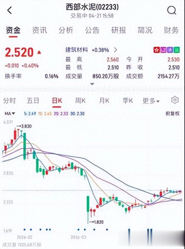 2026年1月28日,西部水泥股价一度攀升至3.83港元的历史新高,较2024年1月低点0.498港元,涨幅高达669%。然而,股价创出历史新高仅两个交易日后,行情便急转直下,2月2日单日大跌15.47%,上涨趋势戛然而止。